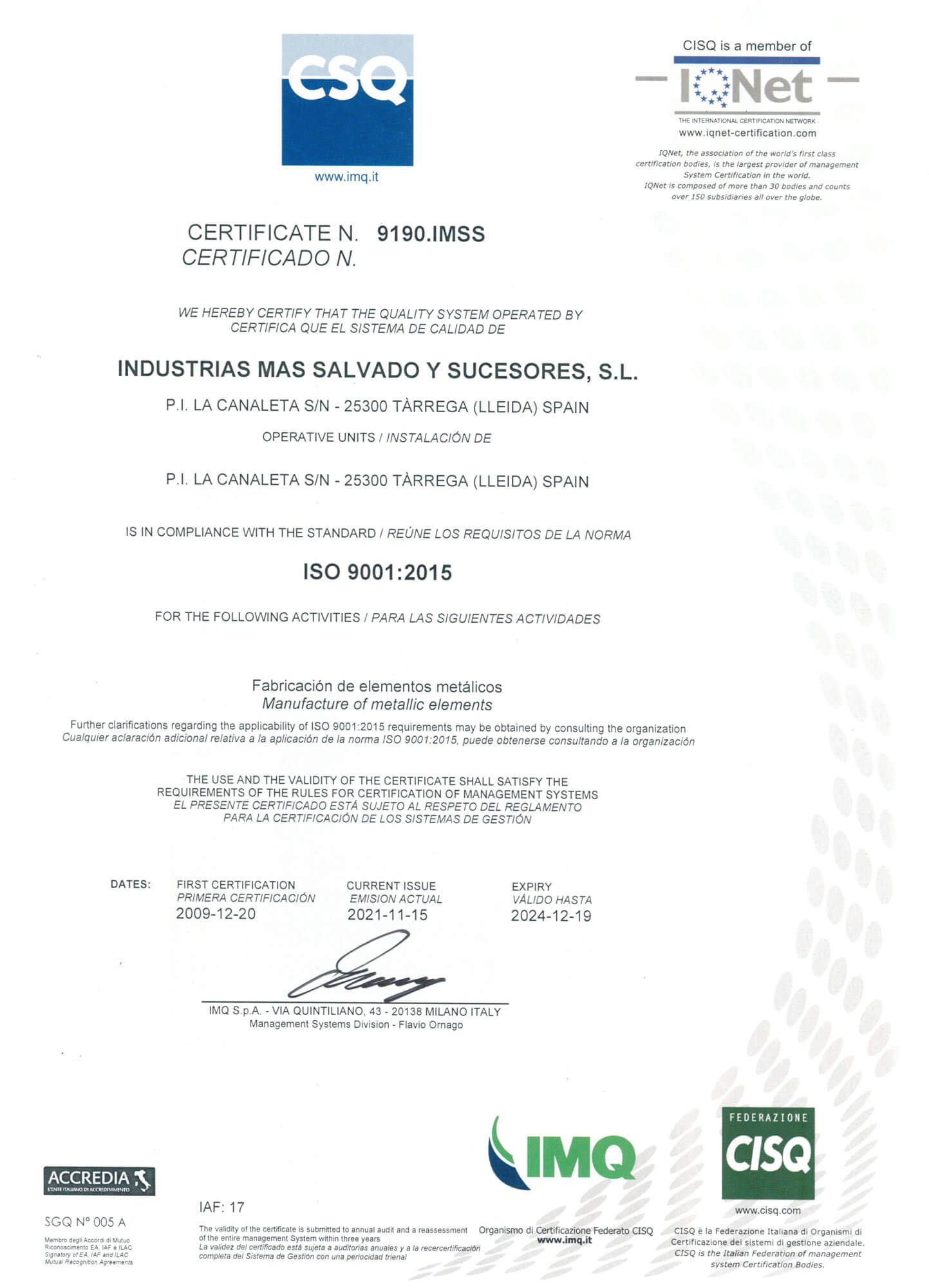 Fabricados bajo los estrictos controles de calidad de nuestra certificación ISO 9001:2015.