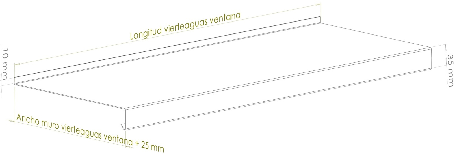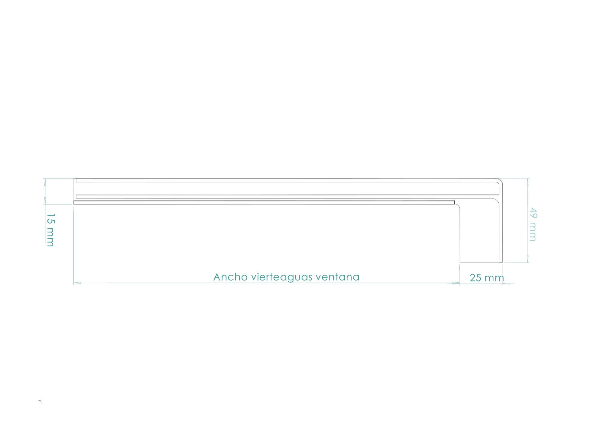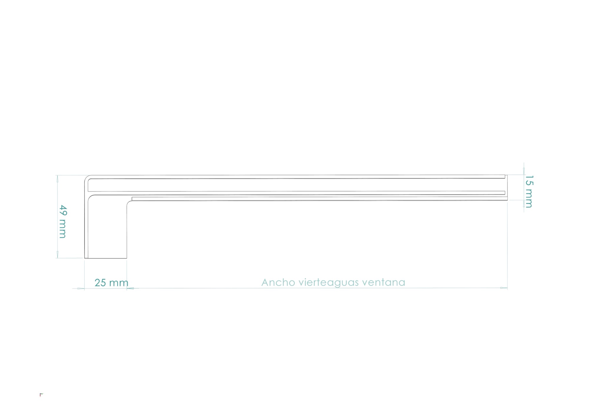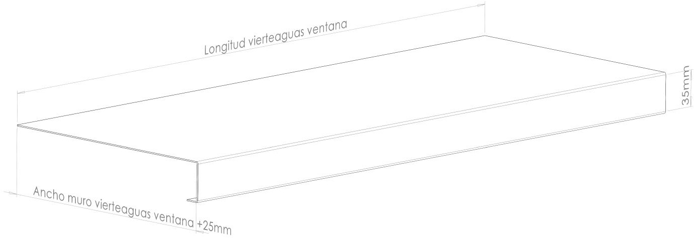 Perfil de vierteaguas estándar. Redirige el agua de lluvia lejos del muro, evitando manchas y filtraciones en la fachada.